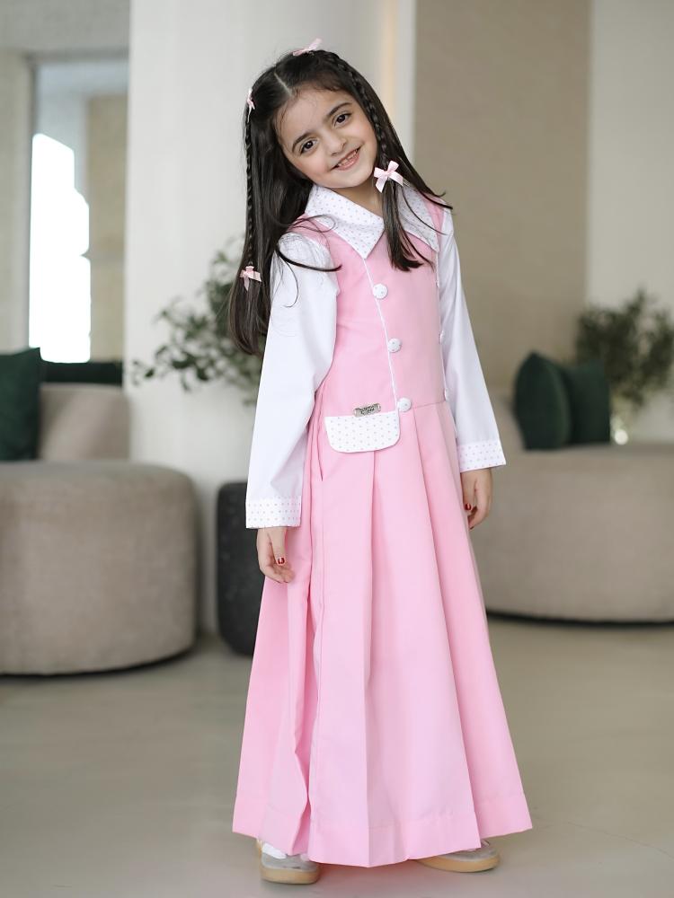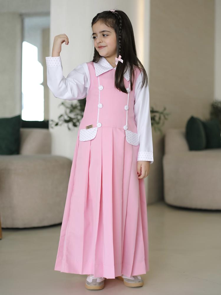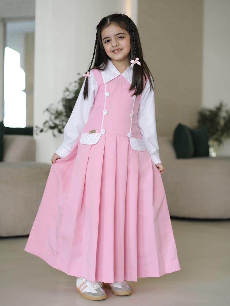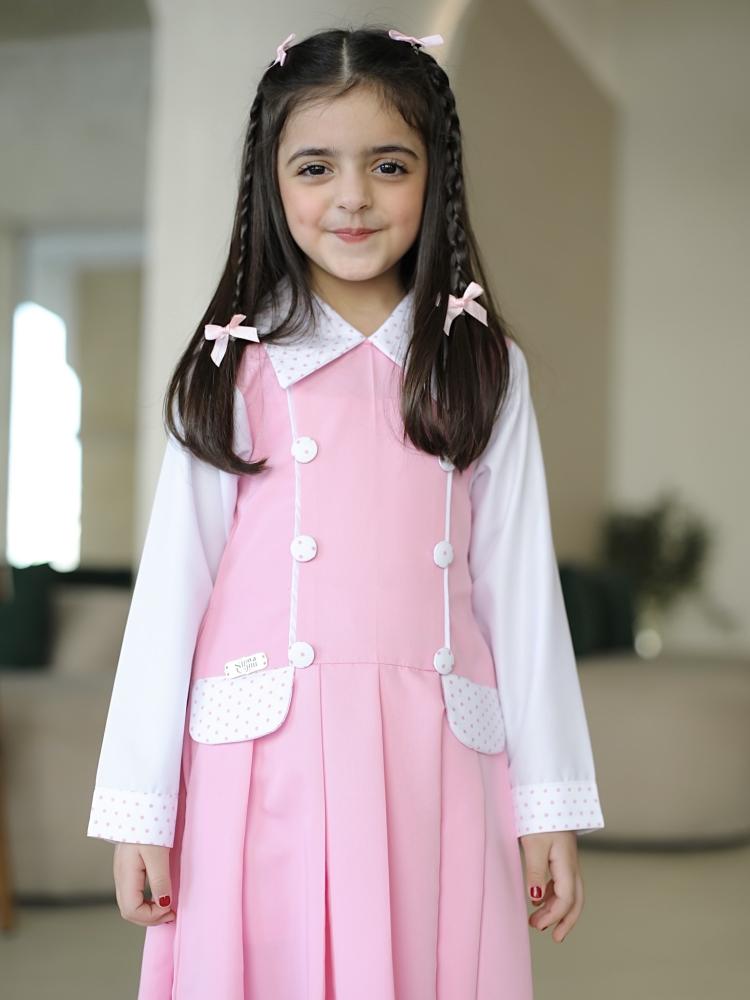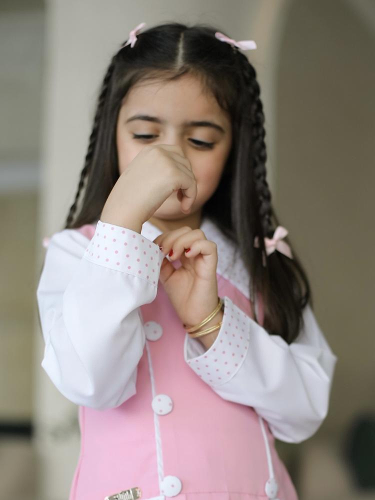 مريول أنيق باللون الوردي الفاتح، يتميز بقصة واسعة ومريحة، مع طيات أمامية تضيف لمسة من الرقي والفخامة التصميم مزوّد بياقة بيضاء منقطة بالوردي، متناسقة مع الأكمام البيضاء الطويلة، مما يضفي طابعًا أنيقًا وطفوليًا في آنٍ واحد. يحتوي على أزرار أمامية بيضاء مزدوجة للزينة، وجيوب أمامية مزينة بنفس نقشة الياقة، مما يعزز من تناغم التصميم.
