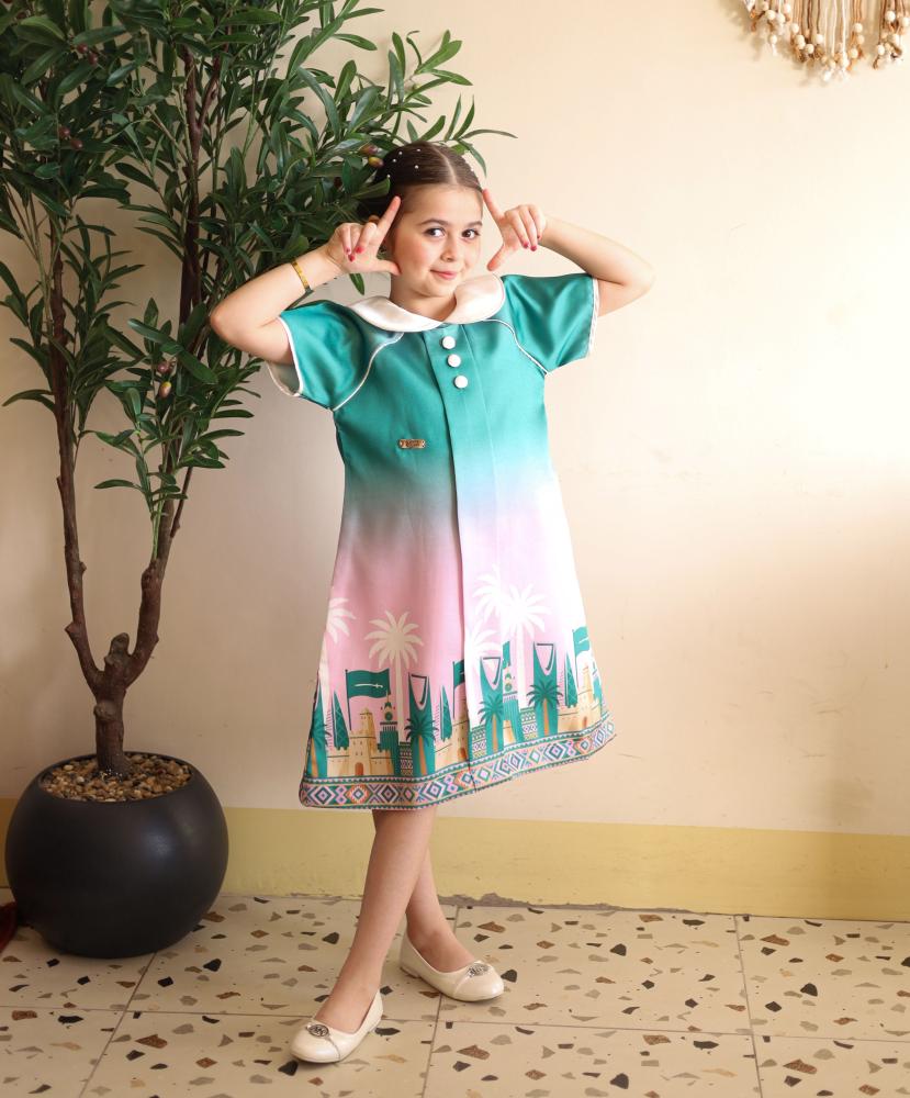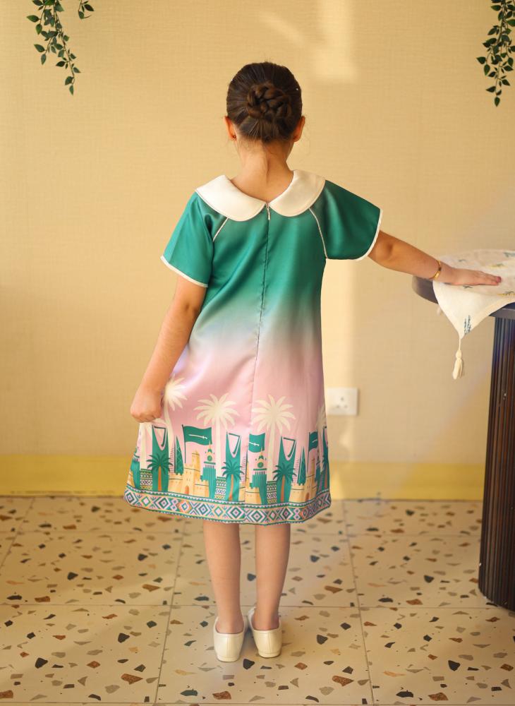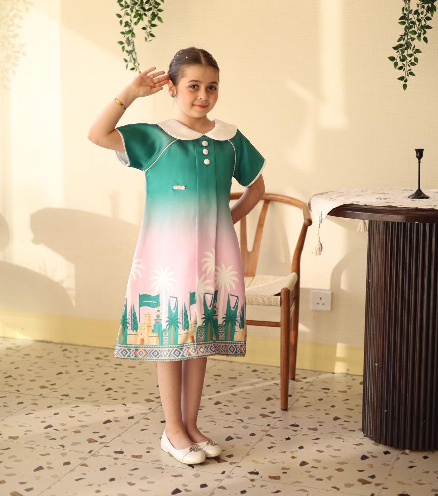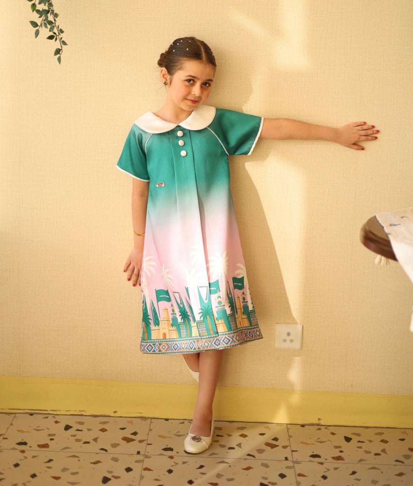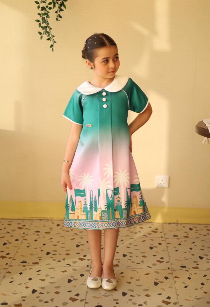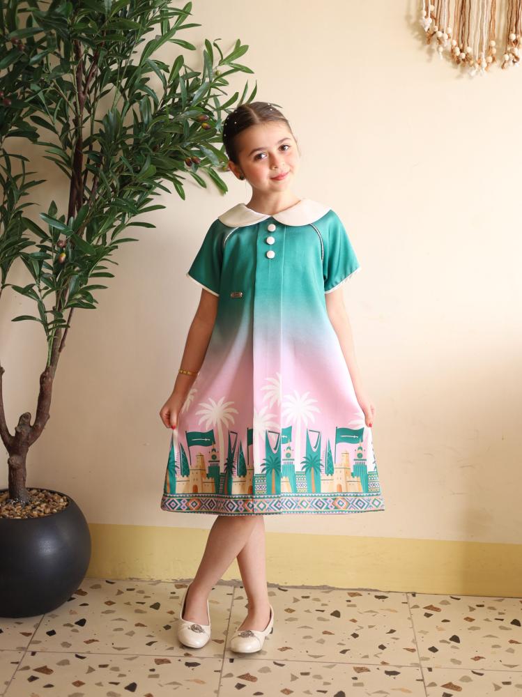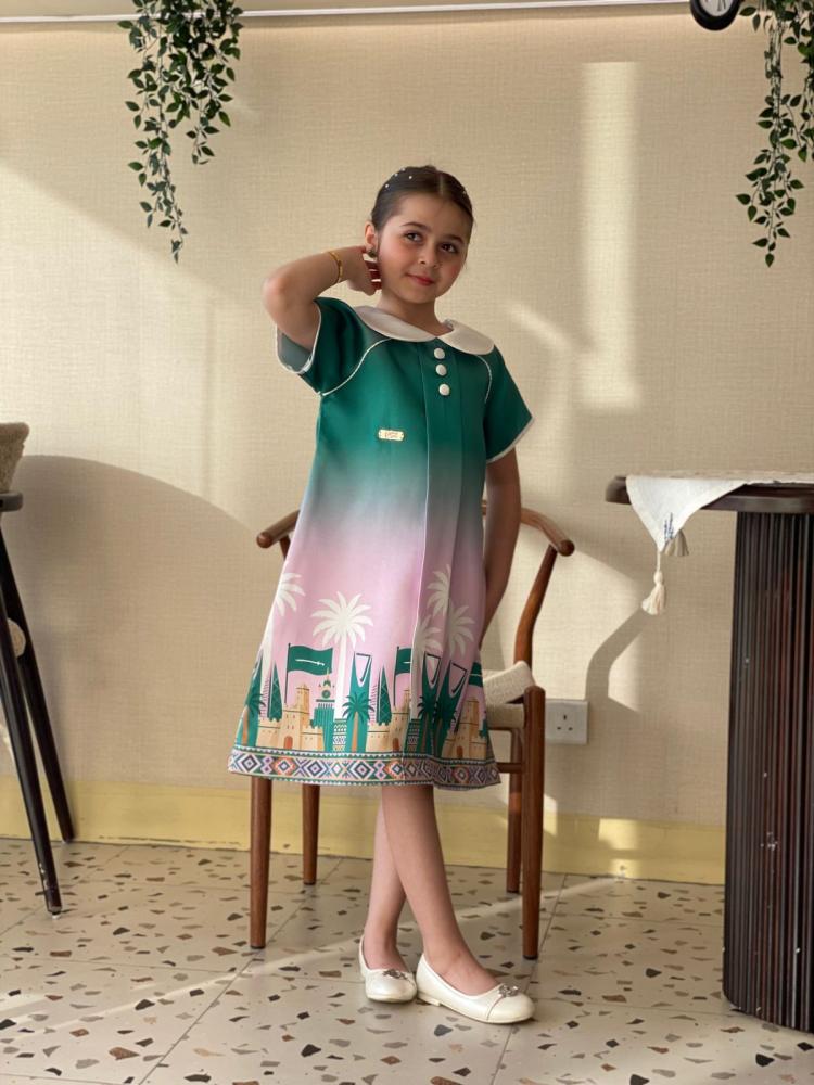 تم تصميم الفستان بقصة طفولية كلاسيكية مريحة مع ياقة بيضاوية أنيقة وأزرار أمامية تضيف لمسة عصرية. القماش مطبوع برسومات مستوحاة من معالم المملكة العربية السعودية مثل النخيل، الأبراج، والمباني التراثية، بألوان متناغمة تجمع بين الأخضر والأبيض والوردي الفاتح لتعكس روح الفرح والانتماء.